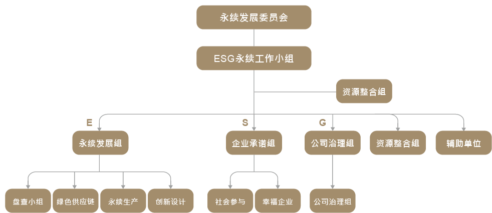 永续会下设ESG永续小组,依功能分为资源整合组、永续发展组、企业承诺组、公司治理组、资讯整合组及辅助单位。透过跨部门协作,定期盘点绩效,拟定优化与改善方案,确实落实ESG政策,强化公司治理公信力,并建立资讯揭露机制与沟通管道,实现与利害关系人有效互动,推动企业永续经营愿景。